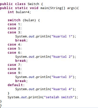 pada contoh diatas case1,case2,case4,case5,case7 dan case8 tidak memiliki pernyataan yang akan dieksekusi jika nilainya cocok dengan nilai varible bulan. karena nilai variable bulan adalah 4 maka progrm akan masuk ke case 4 dan karena tiak ada pernyataan ataupun perintah break, maka program akan terus melanjutkan eksekusi ke baris perintah selanjutnya hingga menemukan printah break yang terdapat pada case 6 dan keluar dari block kode switch untuk kemudian mengeksekusi perintah selanjutnya setelah switch. sehingga didapat output program seperti diatas.