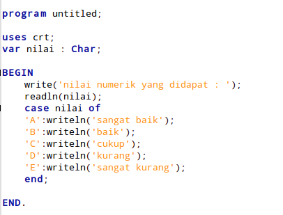 #case - ofstruktur case - of mempunyai suatu ungkapan logika yang disebut dengan selector dan sejumlah statement yang diawali dengan suatu lable permasalahan (case label) yang mempunyai tipe sama dengan selector. statement yang mempunyai case label yang bernilai sama dengan case label yang bernilai sama dengan nilai selector akan diproses sedang statement yang lainnya tidak. bentuk struktur dari case-of