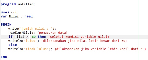 if pilihan = 2 then begin {jika kondisi terpenuhi , yaitu jika pilihan = 2} ... ... end else {jika kondisi tidak terpenuhi, yaitu jika pilihan tidak sama dengan 2} begin ... ... end;