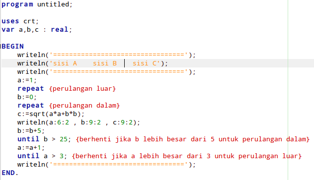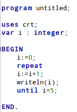 | #perulangan repeat-until digunakan untuk mengulang statement-statement atau blok statement samapi(until) kondisi yang diseleksi di until tidak terpenuhi sintaks dari statement ini adalah:
